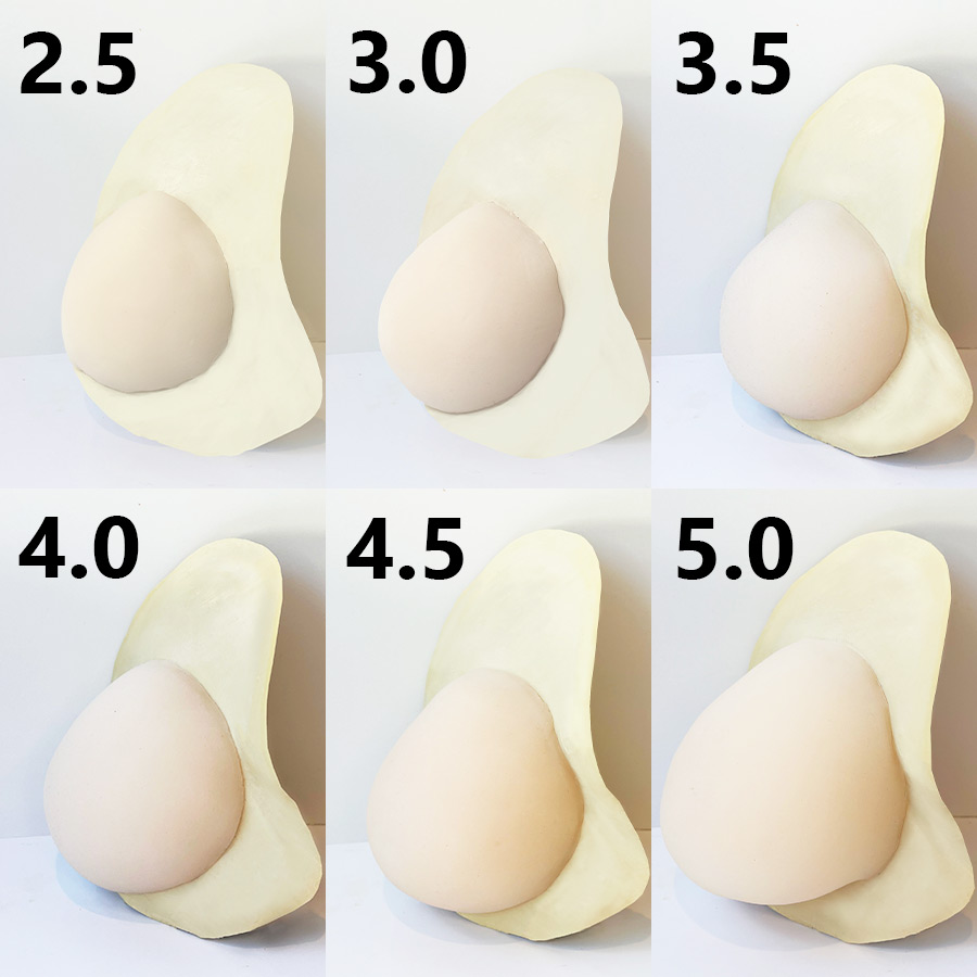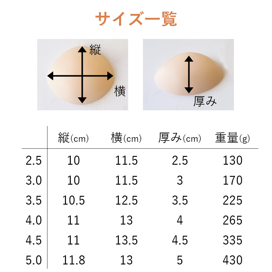 サイズ2.5~5.0は、パッドの厚みを示しています。ご自身の健側のお胸の高さを目安にお選びください。