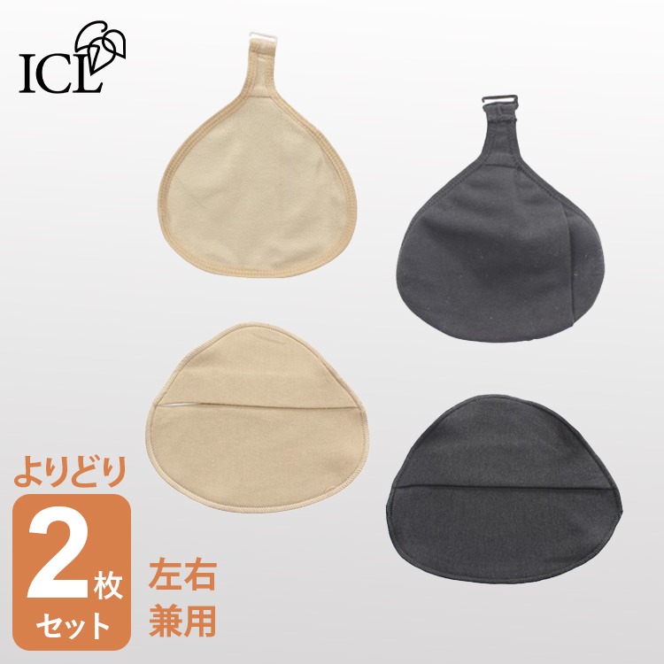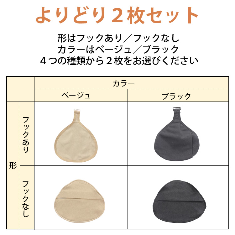乳がん手術後の毎日に、もっと安心と快適を。こちらは、乳房パッドをやさしく包む「三角型のパッドカバー」です。フックあり/フックなし、2カラーの“4種類からよりどり2枚セット”で購入できる人気商品です。三角形のパッドだけでなく、丸型のパッドにも使用できます。両胸兼用です。