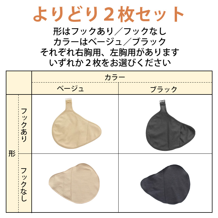 横長ショートタイプの乳房パッドに使用できるパッドカバーです。シリコン製や布製、スポンジ製など様々なタイプの胸パットに使用できます。お持ちのパッドに合わせたサイズをお選びください。フックあり/フックなし、2カラーの“4種類からよりどり2枚セット”で購入できる人気商品です。右胸用、左胸用があります。