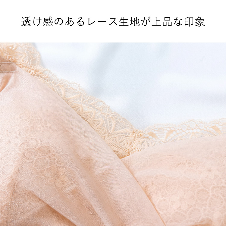 胸元には透け感のあるレース生地をあしらい、軽やかで上品な印象に。