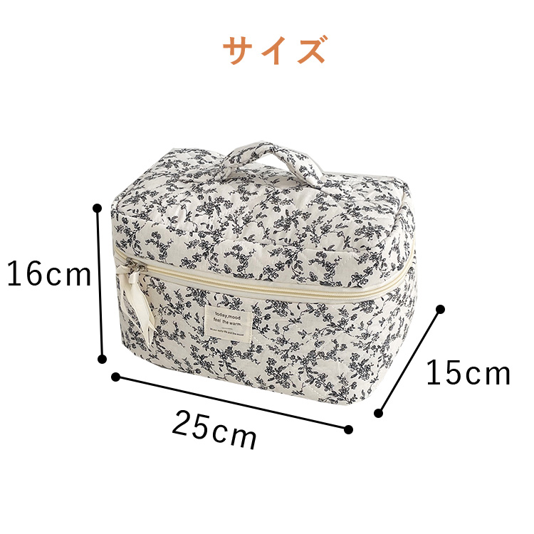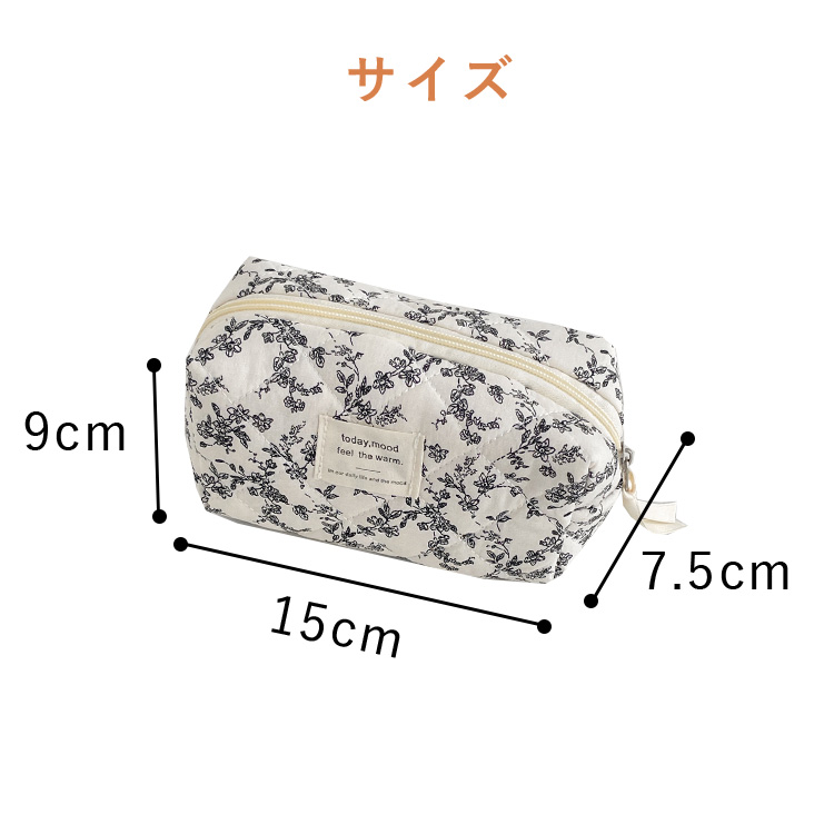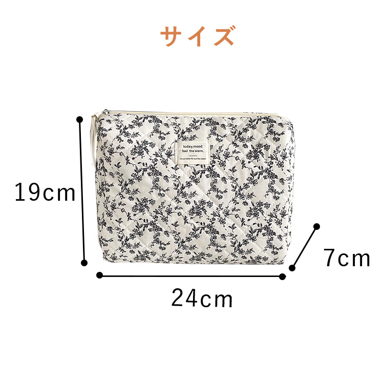 表地は肌触りの良いコットン素材を使用。中綿の入ったふっくらとしたキルティング生地で、中身を優しく守ります。シックなモノトーン調の小花柄は、大人かわいい、韓国風、北欧風など様々なスタイルに馴染みます。
