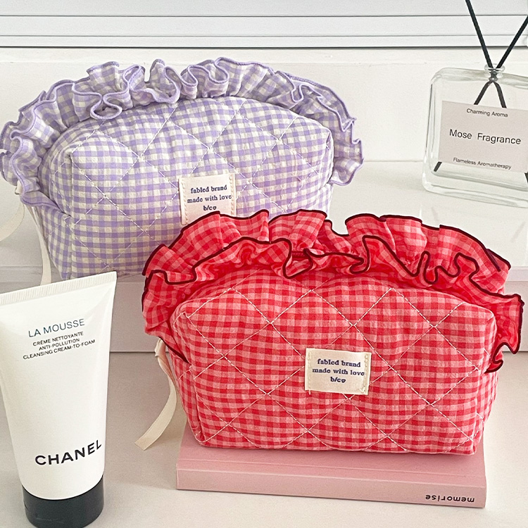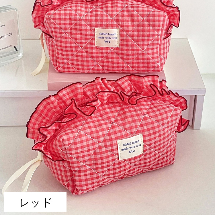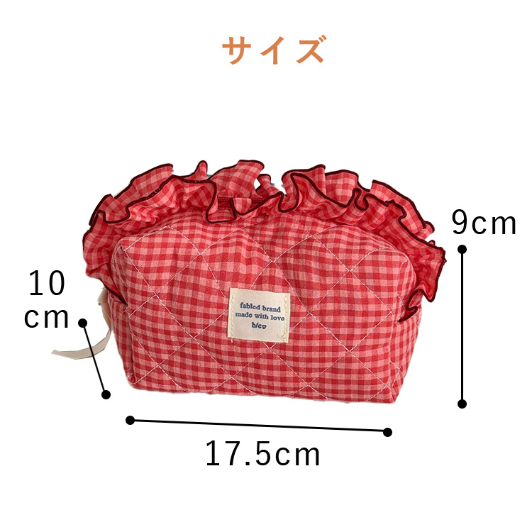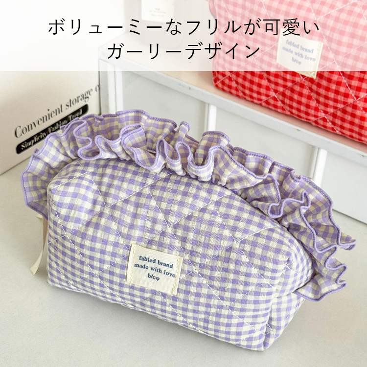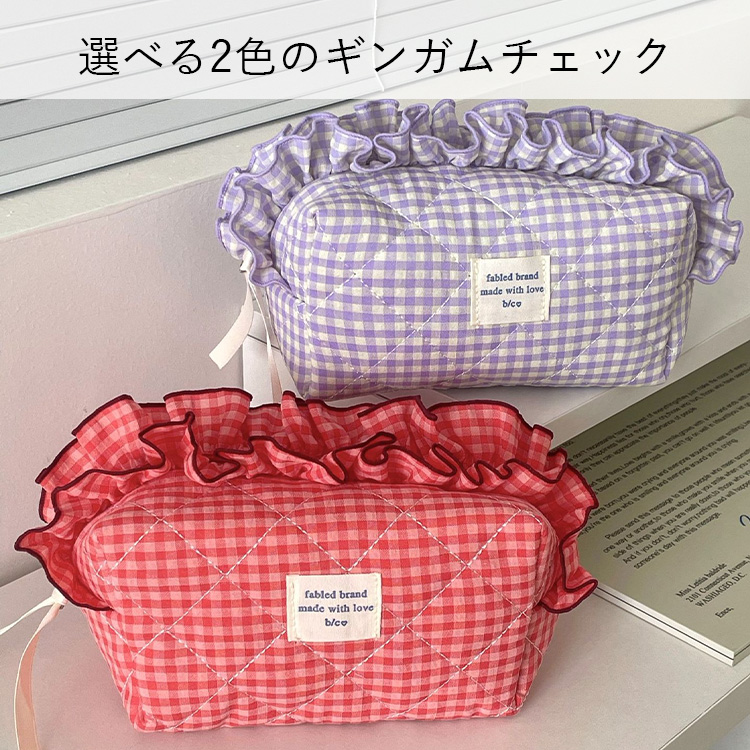 たっぷりのフリルとキュートなギンガムチェック柄が目を引く、主役級のキルティングポーチです。