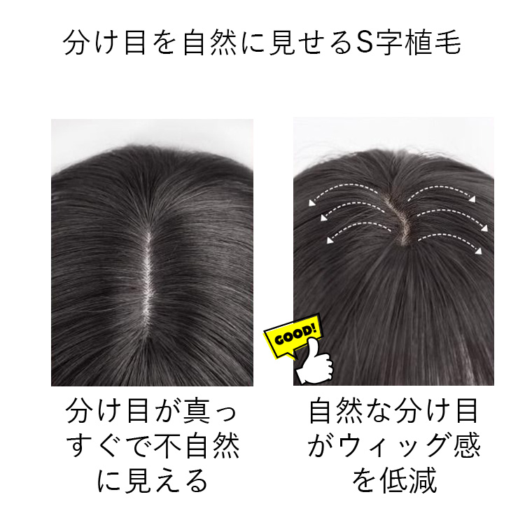 従来の不自然な分け目とは違い、ふんわりと立ち上がる立体的なS字植毛を採用。ウィッグだと気づかれにくい自然さを実現しました。