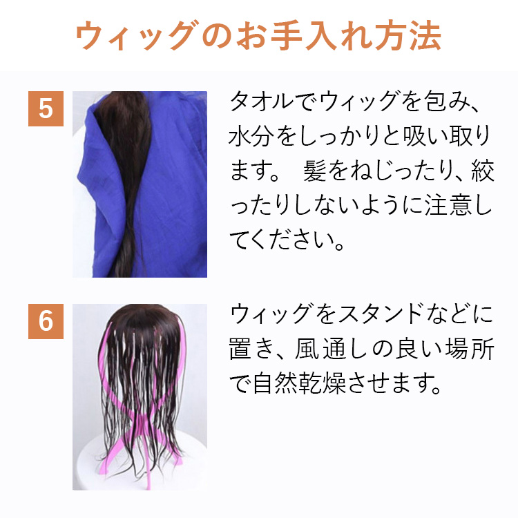 5. タオルでウィッグを包み、水分をしっかりと吸い取ります。髪をねじったり、絞ったりしないように注意してください。